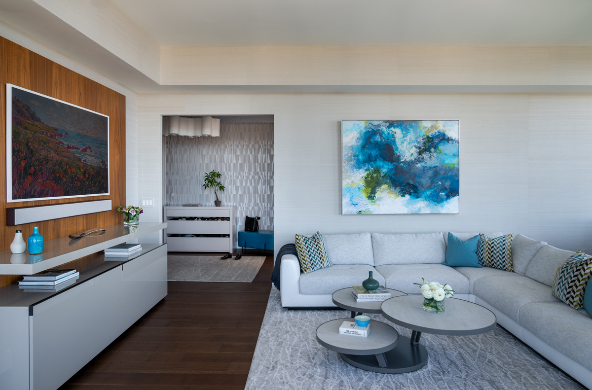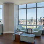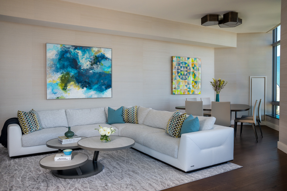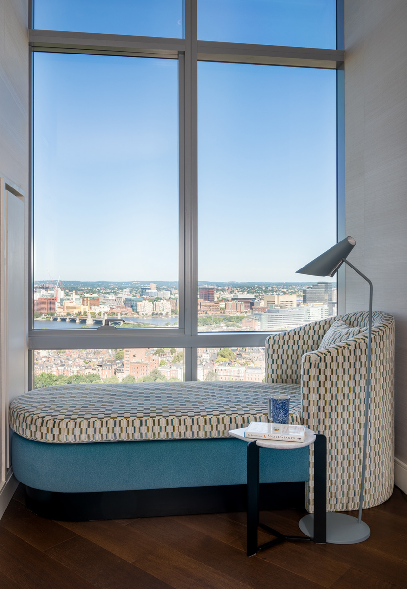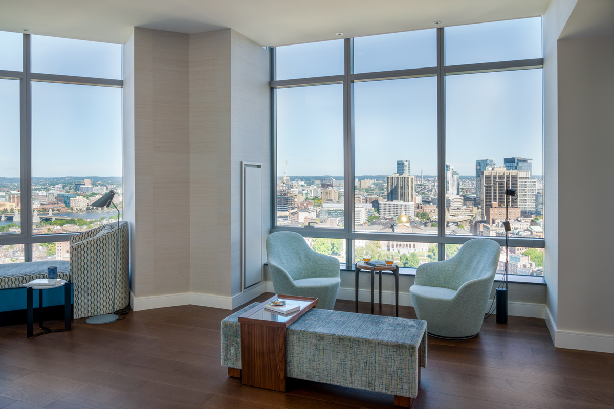 Modern design in a Boston skyscraper penthouse. The previous owner's decor was very traditional and in need of an update. The new owners wanted something that felt clean and modern, very much "city living." They wanted to be able to entertain and to have a place their adult children would want to visit. The views of the 4th of July fireworks and the Esplanade at the Charles River make for wonderful parties.
