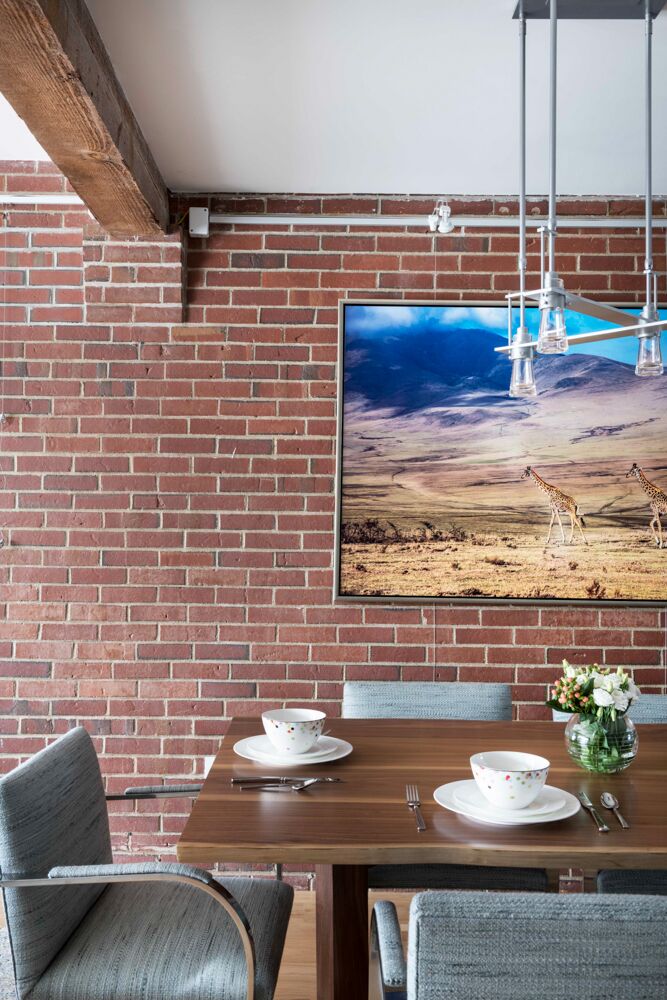 In the suburbs, this couple lives in a Victorian home and they wanted their city pied-à-terre to feel warm and modern, complementing the brickwork and exposed beams while also being comfortable and age appropriate.